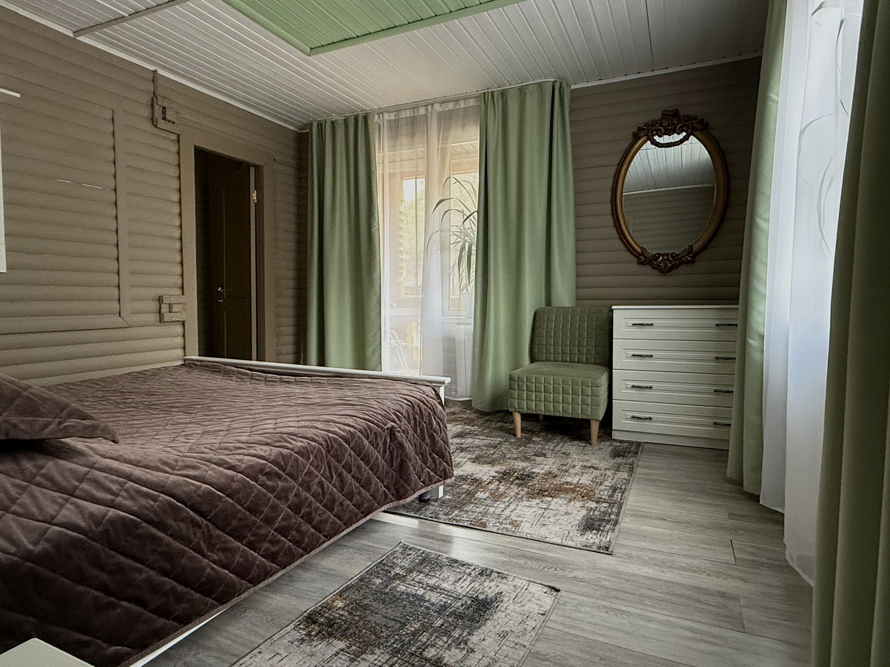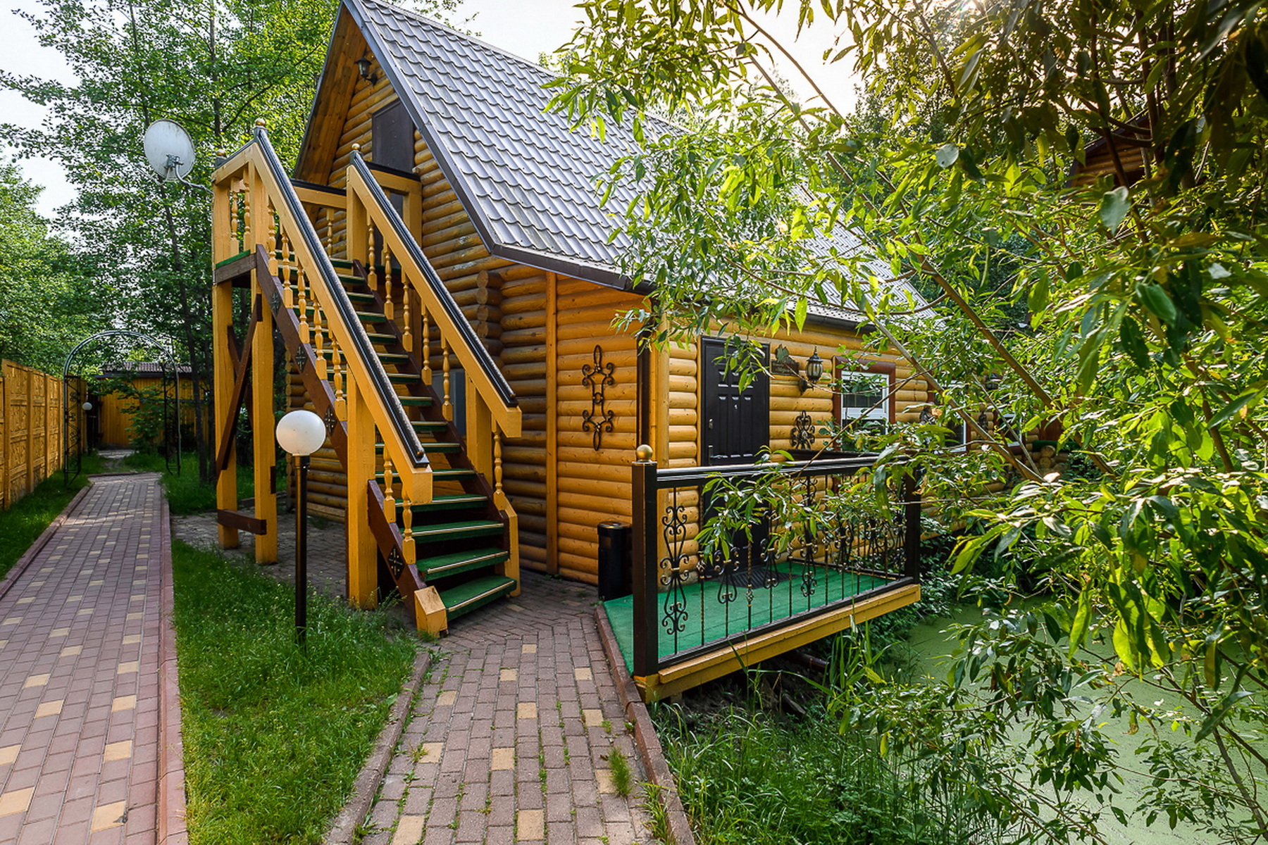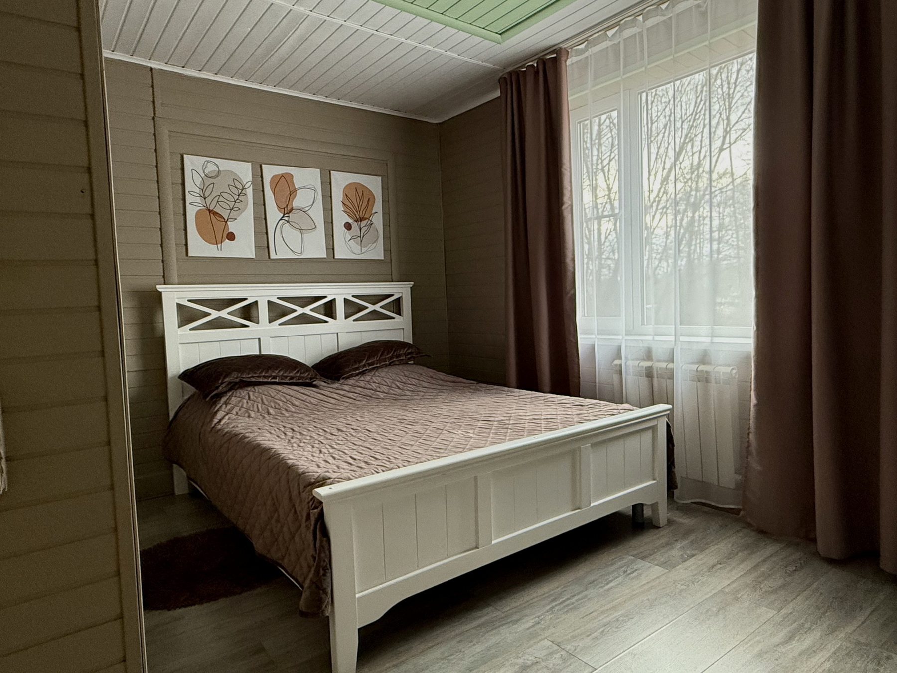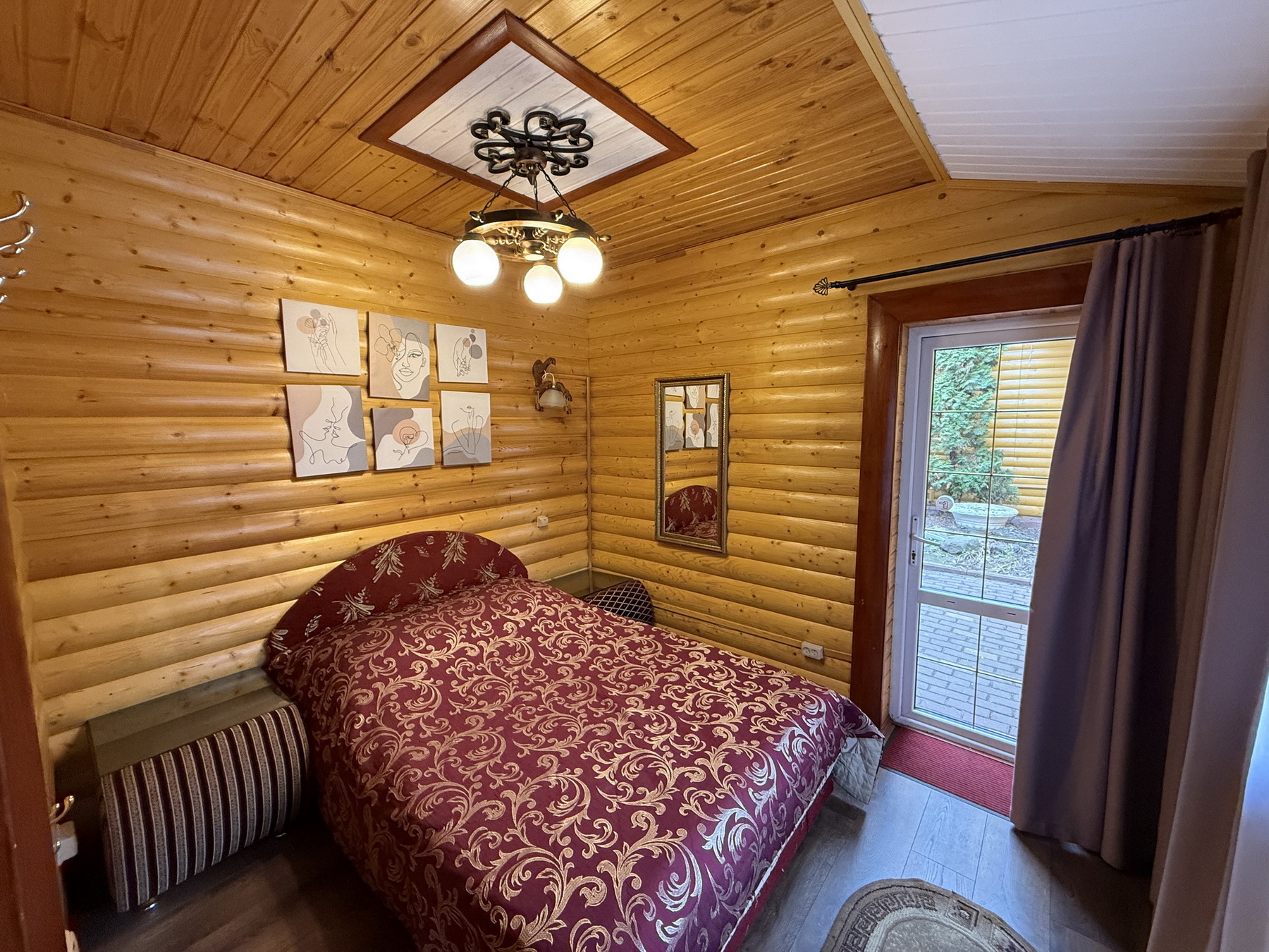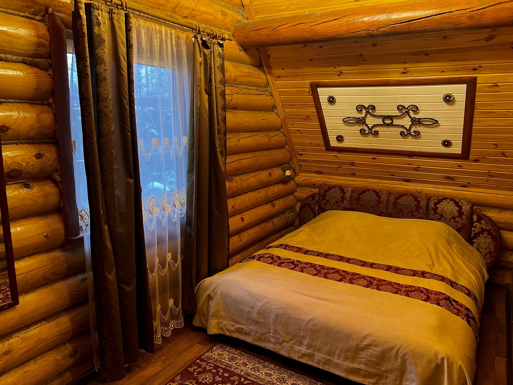 Уникальный двухэтажный коттедж из натурального деревянного сруба располагает к уединенному отдыху. С балкона второго этажа открывается живописный вид на озеро. Для комфорта гостей предусмотрены три двуспальные кровати а также двуспальный раскладной диван. Душевых комнат две на первом и втором этажах, каждая укомплектована туалетными принадлежностями. В числе удобств финская сухая сауна. Кроме коттеджа на территории комплекса имеется отапливаемый «Чайный домик» с настоящим камином и мягкой мебелью. В распоряжении гостей закрытая территория с беседкой и мангальной зоной, предоставляется мангальный набор (посуда, шампуры/решетка). К услугам гостей частная парковка. В коттедже ежедневно производится уборка, смена белья и полотенец производится по запросу. Фен предоставляется по запросу.