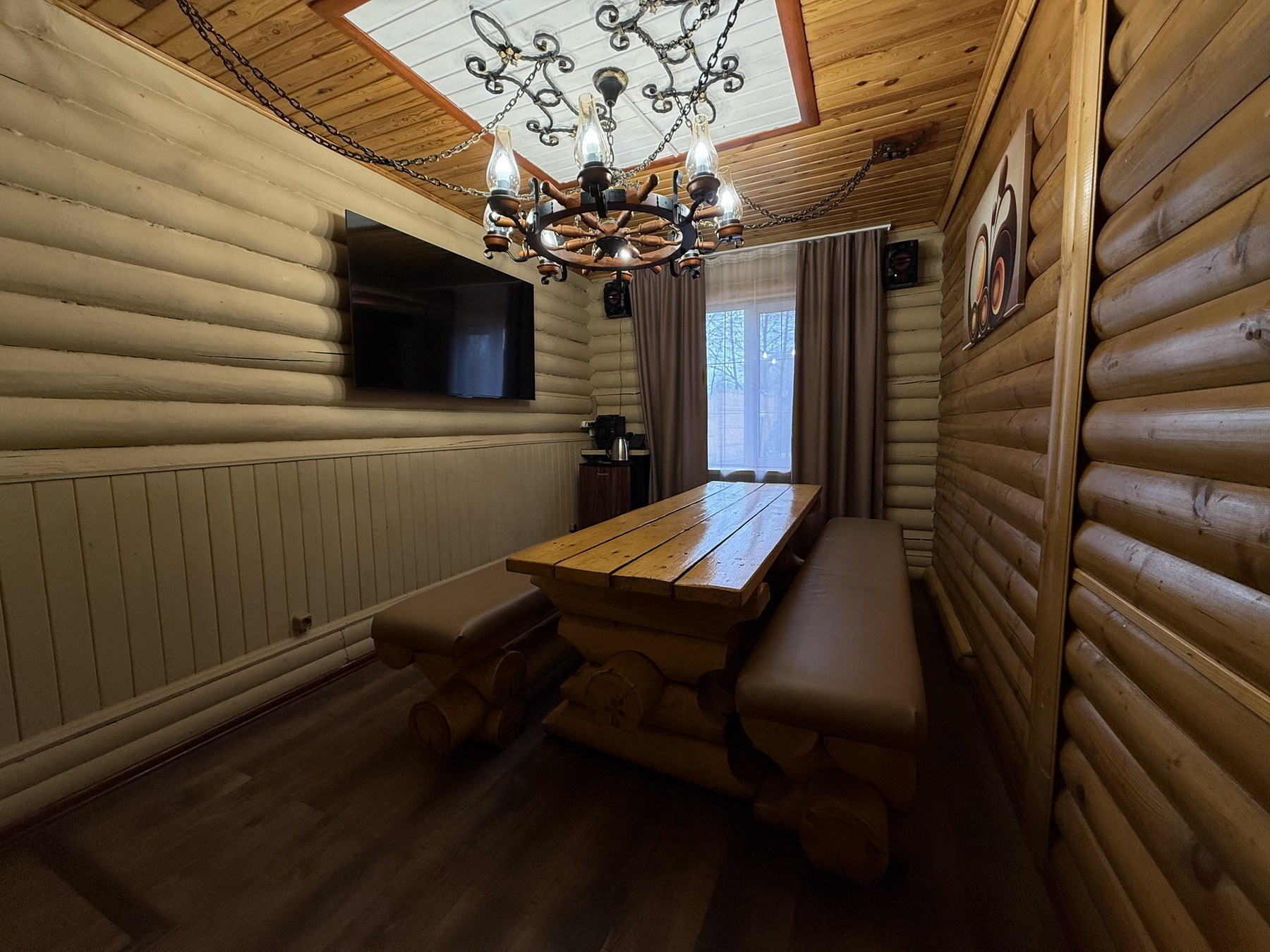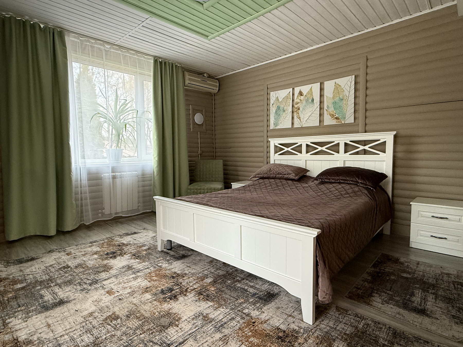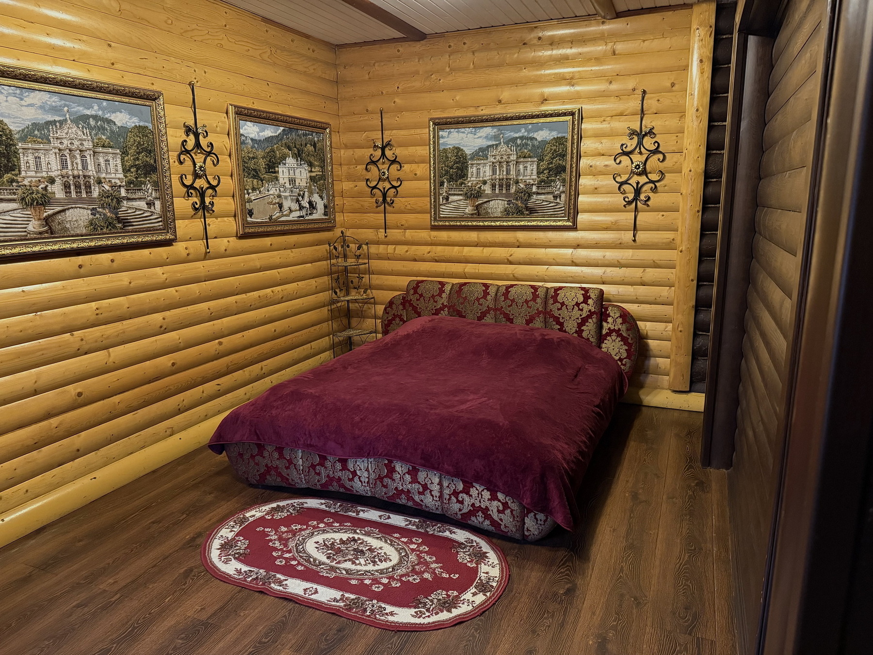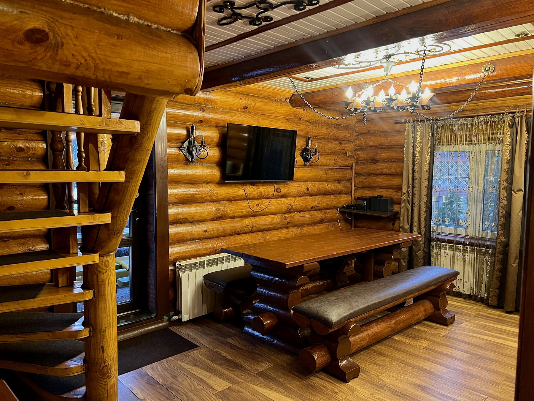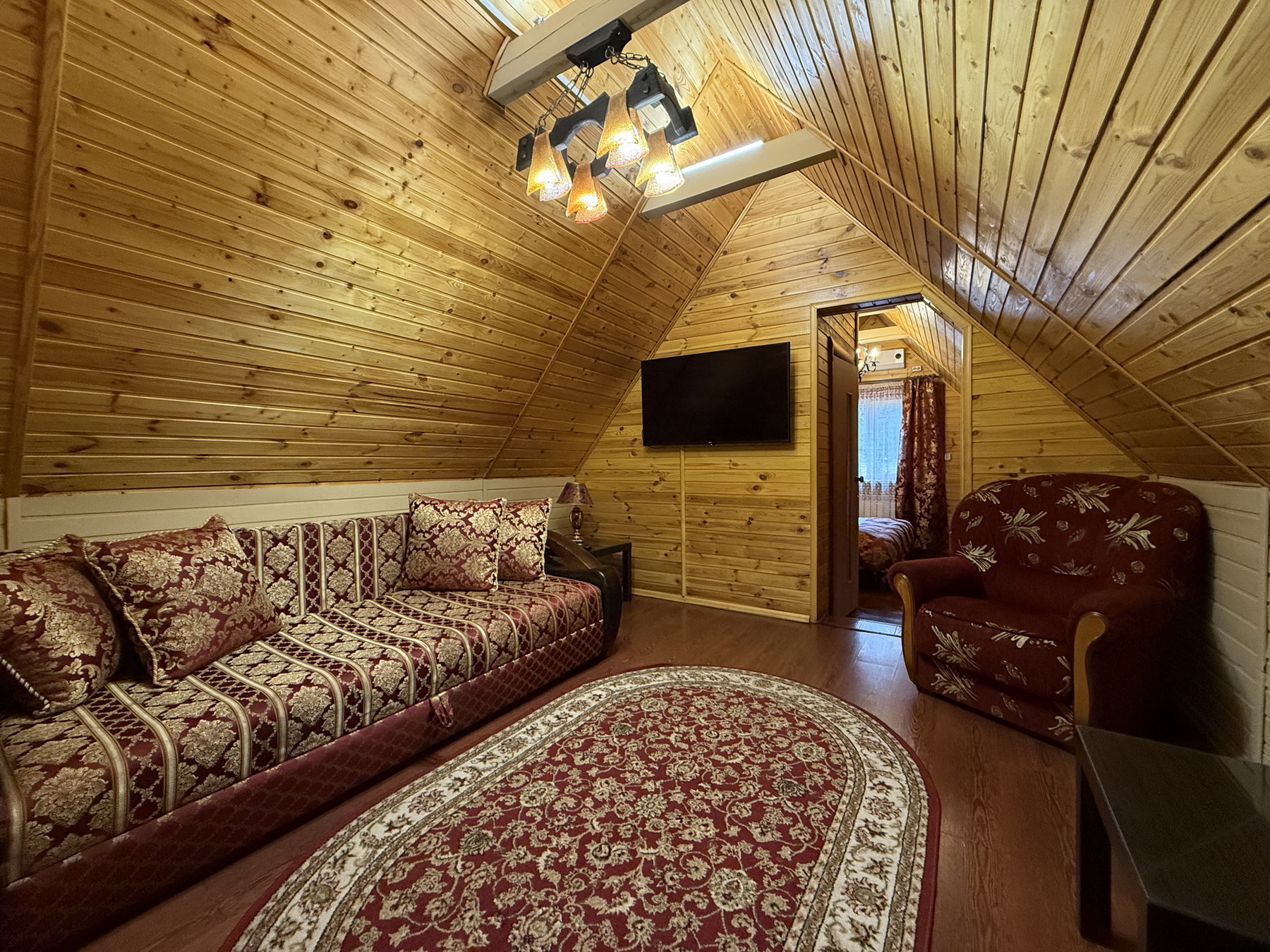 Двухэтажный коттедж из натурального деревянного сруба расположен в центральной части Клуб-Отеля на берегу небольшого озера. Для комфортного отдыха предусмотрена двуспальная кровать, зоны отдыха с двумя двуспальными раскладными диванами. В распоряжении гостей небольшая сухая сауна, балкон и беседка с мангальной зоной, предоставляется мангальный набор (посуда, шампуры/решетка). Обустроена зона для игры в бильярд с мягкой мебелью. В коттедже ежедневно производится уборка, смена белья и полотенец производится по запросу. Душевая комната укомплектована туалетными принадлежностями. Фен предоставляется по запросу.