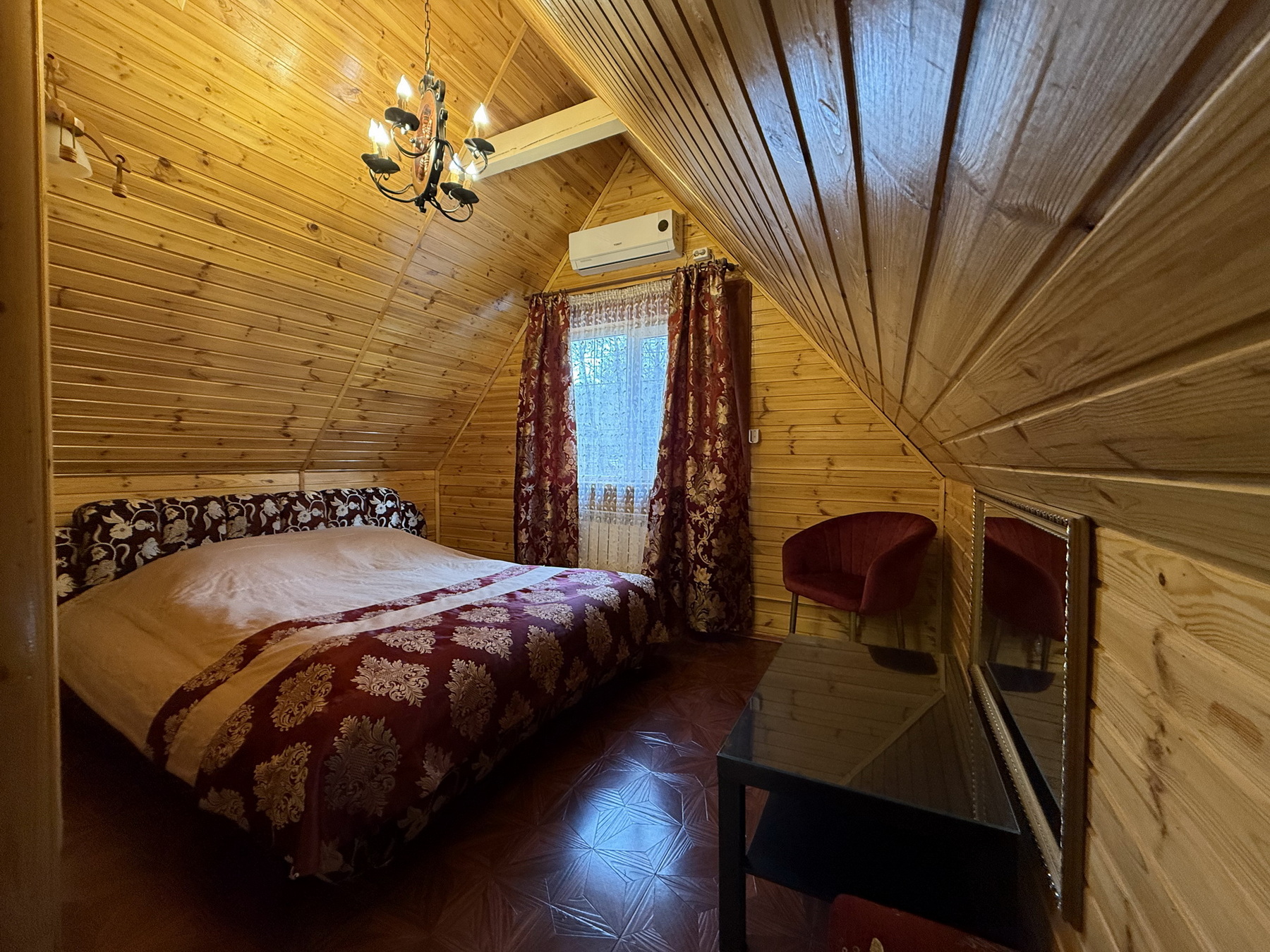 Двухэтажный деревянный коттедж расположен в парковой части Клуб-Отеля в непосредственной близости от живописного озера. Для комфортного отдыха предусмотрена двуспальная кровать, зоны отдыха с двумя двуспальными раскладными диванами. Душевых комнат две на первом и втором этажах, каждая укомплектована туалетными принадлежностями. В распоряжении гостей закрытая территория с беседкой и мангальной зоной, предоставляется мангальный набор (посуда, шампуры/решетка). В коттедже обустроена кухня и оснащена всем необходимым для самостоятельного приготовления пищи. В коттедже ежедневно производится уборка, смена белья и полотенец производится по запросу. Фен предоставляется по запросу.